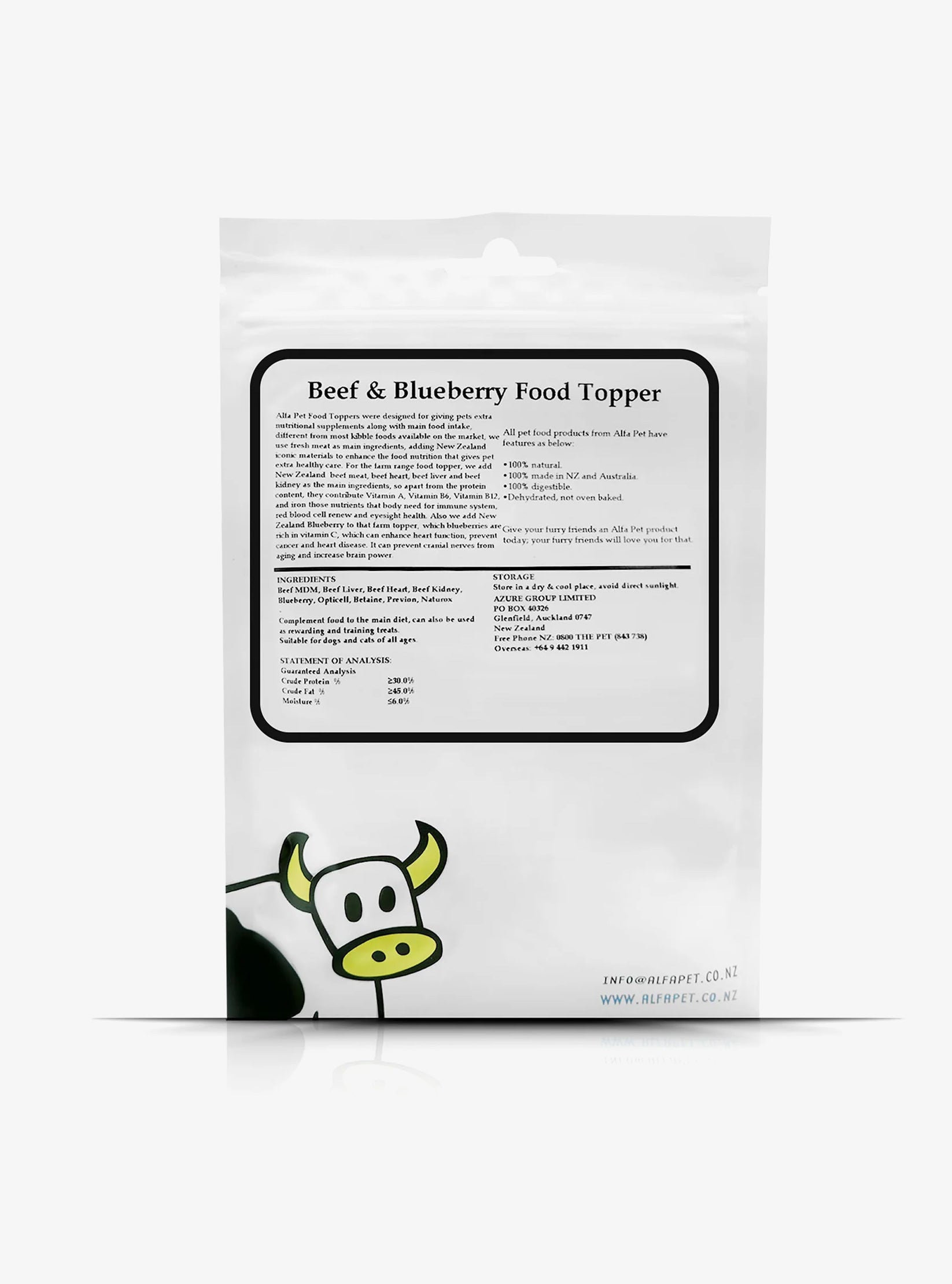 Alfa Pet Beef & Blueberry Jerky is designed for giving pets extra nutritional supplements along with main food intake, different from most kibble foods available on the market. We use fresh meat as main ingredients, adding New Zealand iconic materials to enhance the food nutrition that gives pet extra healthy care.