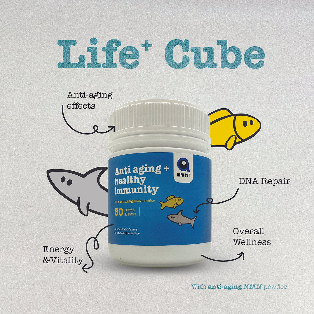 Alfa Pet Life+ Cube with NMN - a scientifically formulated supplement specifically designed for pets aged 8 years and above. As pets enter their senior years, their bodies begin to slow down, and signs of aging, like reduced energy, mobility issues, and cognitive decline - can start to appear.