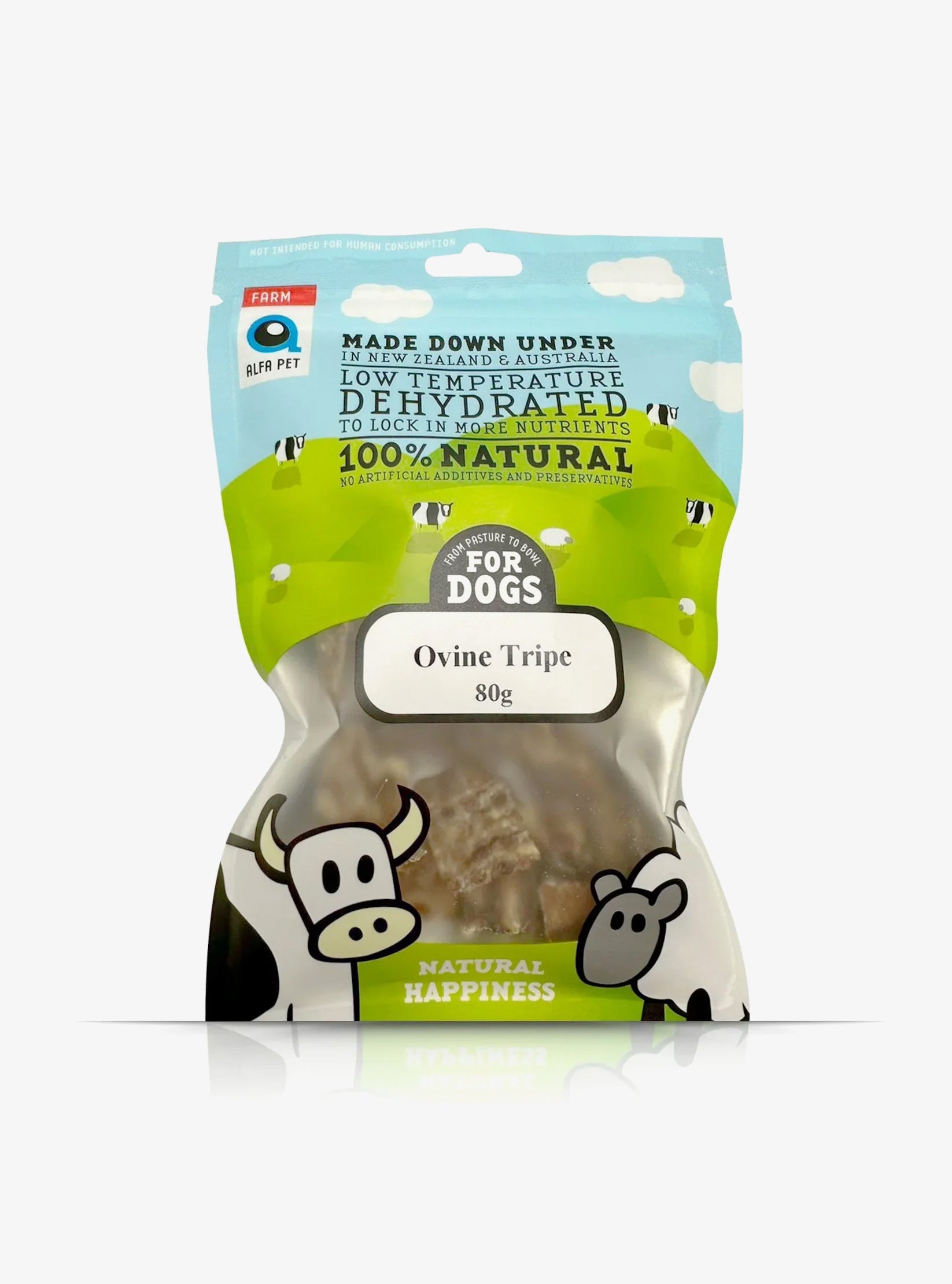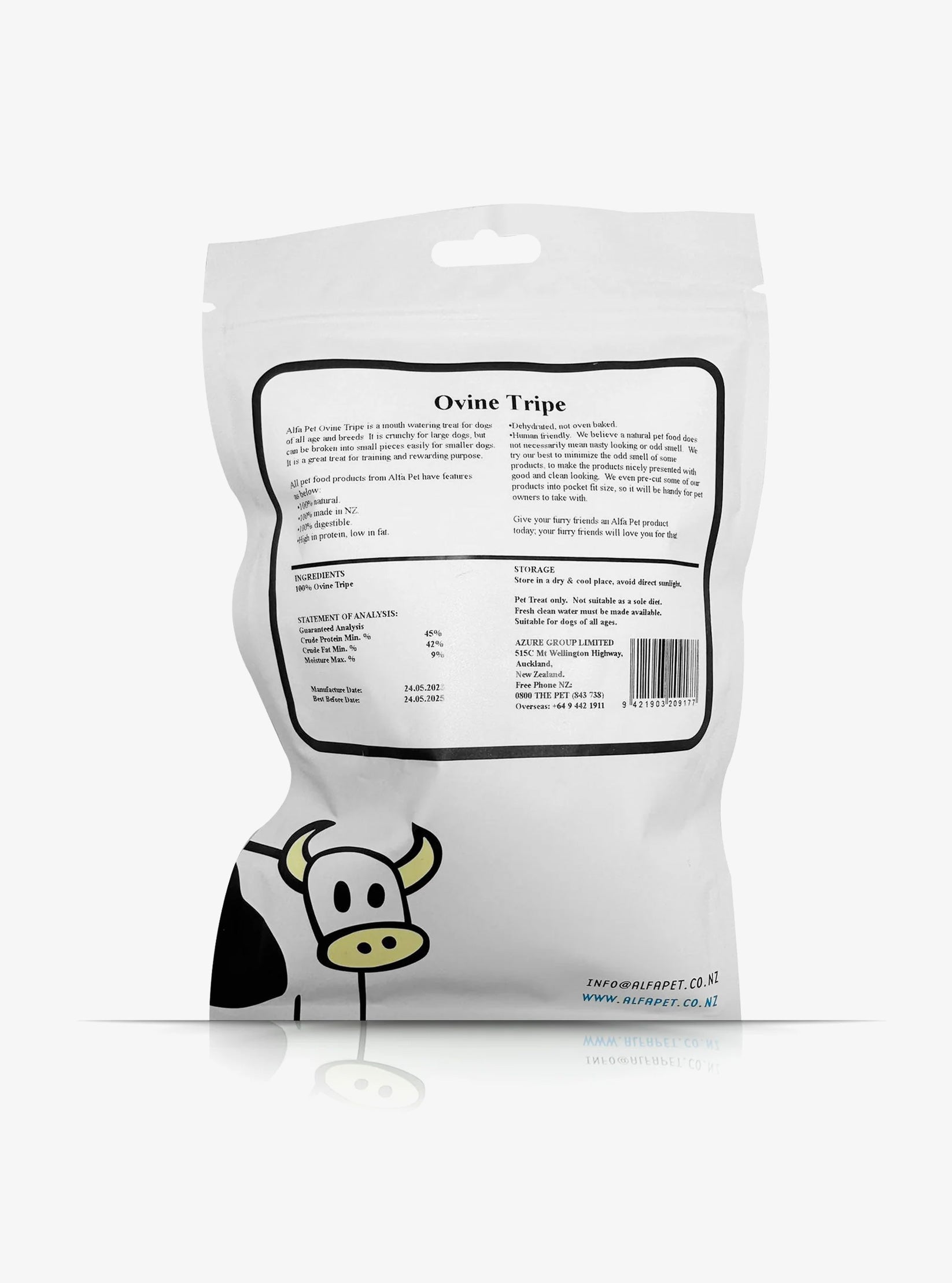 Alfa Pet Ovine Tripe is a mouth watering treat for dogs of all ages and breeds. It is crunchy for large dogs, but can easily broken into smaller pieces for small dogs. It's a great treat for training and rewarding purposes.