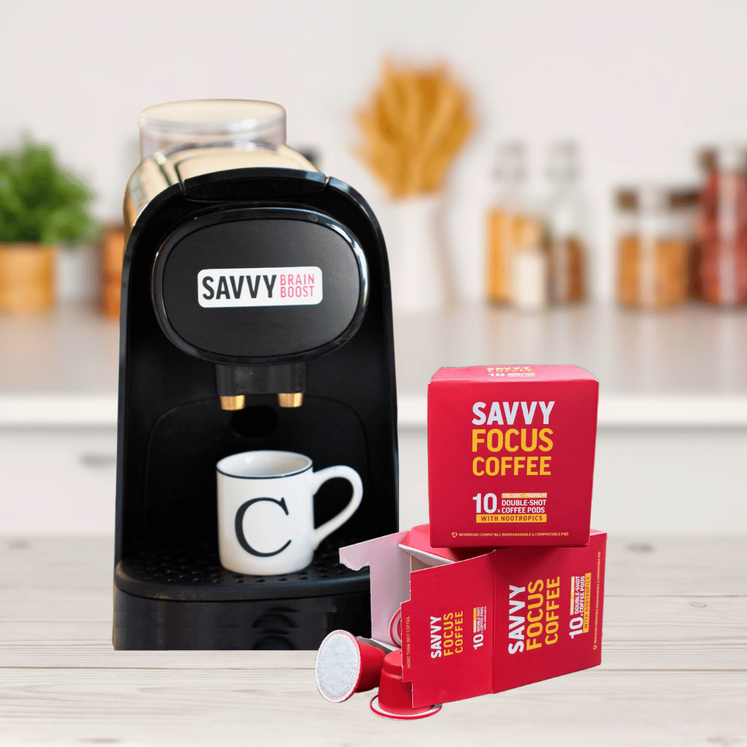 Savvy Smart Coffee brain boost Double Shot Pods are a coffee revolution like no other – the ultimate blend of flavour and science-backed benefits that transcends your ordinary coffee routine. Each box has 10 eco-friendly, compostable pods.